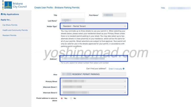 - Postal address is same as above:郵送先が上の住所と同じかどうか