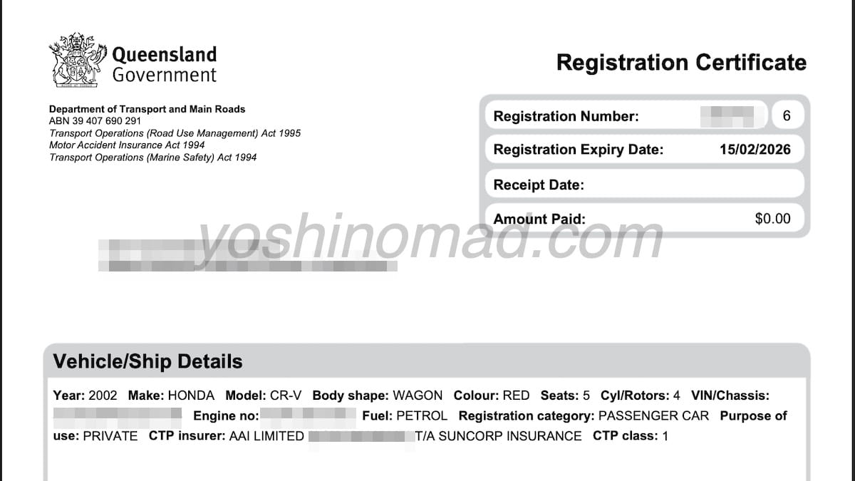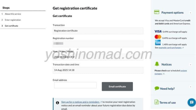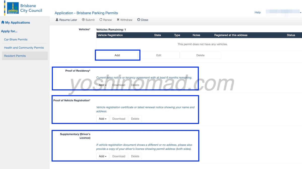 - Proof of Vehicle Registration: 「Add」からRegistration Certificateを添付