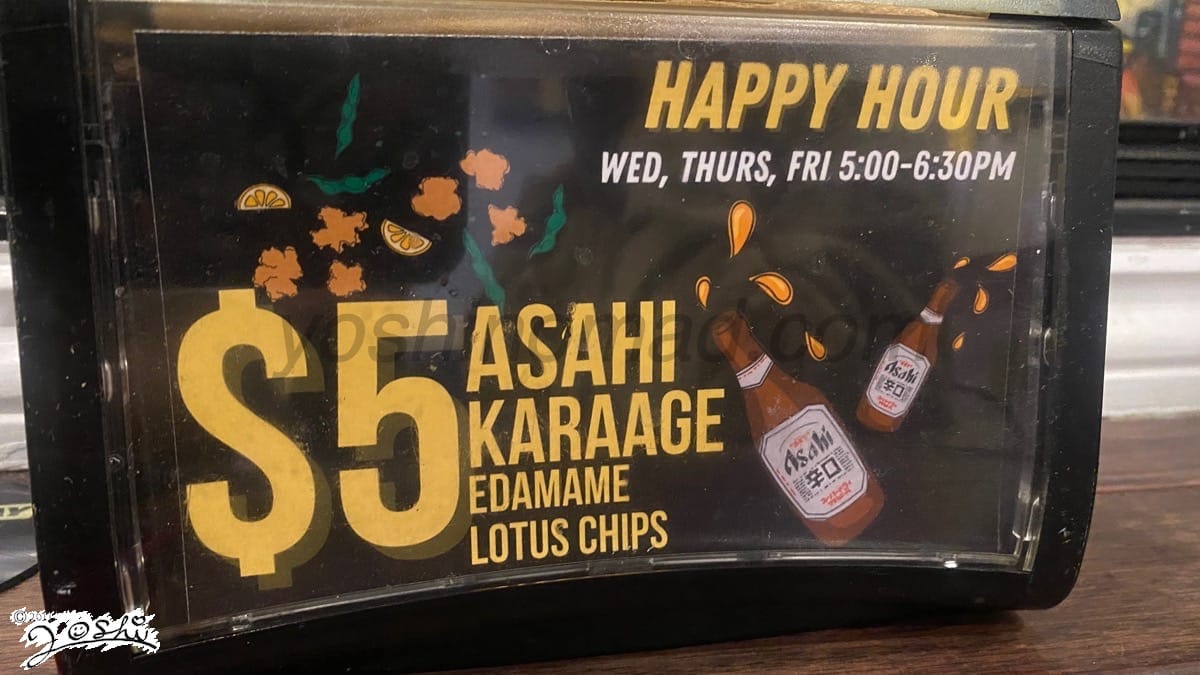 水・木・金曜日にはラーメンのプロモーションはありませんが、アサヒビールが1杯$5になるお得なディールがあります。さらに、枝豆・唐揚げ・レンコンチップスも各$5。
